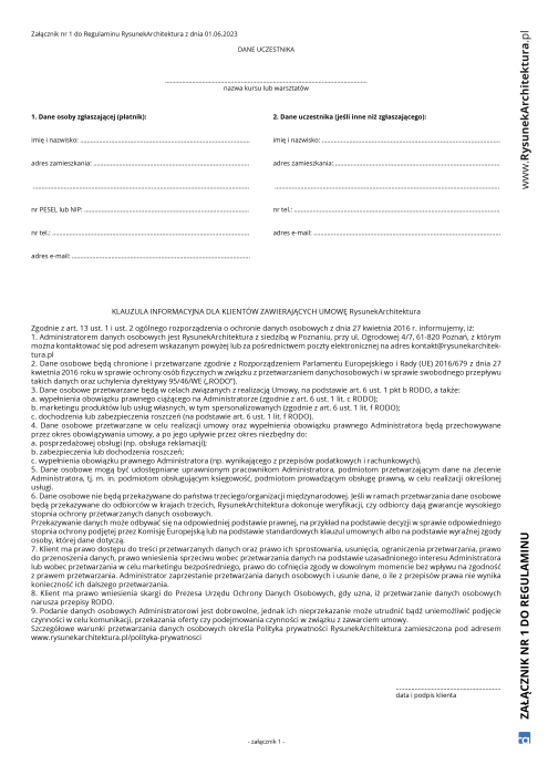 1. W przypadku zapisu na zajęcia, na które uczestnik zapisał się za pośrednictwem strony internetowej www.rysunekarchitektura.pl obowiązują przepisy ustawy z dnia 30 maja 2014 r. o prawach konsumenta (Dz.U 2014 poz. 827).