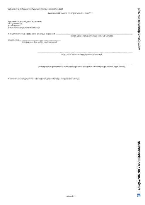 3. Wzór oświadczenia o odstąpieniu od umowy stanowi załącznik nr 2 do regulaminu, skorzystanie z wzoru odstąpienia od umowy nie jest obowiązkowe. Dla skutecznego odstąpienia od umowy wystarczające jest złożenie jednoznacznego oświadczenia na piśmie i przesłanie go pocztą lub za pośrednictwem poczty elektronicznej na adres e-mail kontakt@rysunekarchitektura.pl.