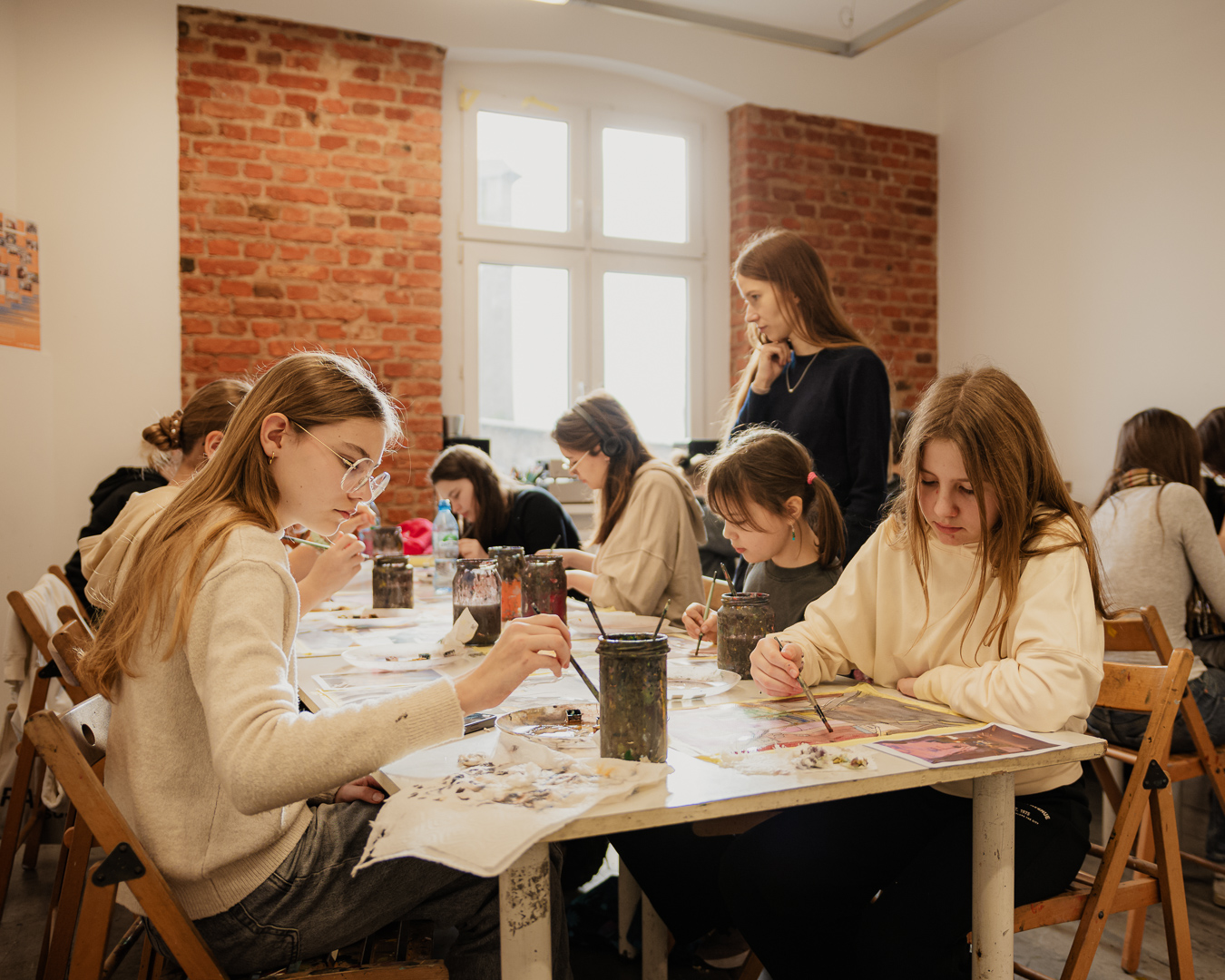 - Uczestnicy regularnych warsztatów hobbystycznych i kursów do liceum plastycznego, którzy są naszymi uczniami od min. 2 lat