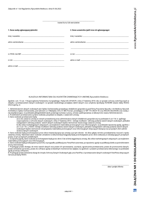 c) treść niniejszego regulaminu jest zamieszczona na stronie internetowej www.rysunekarchitektura.pl oraz w formie wydrukowanej znajduje się w siedzibie RA,