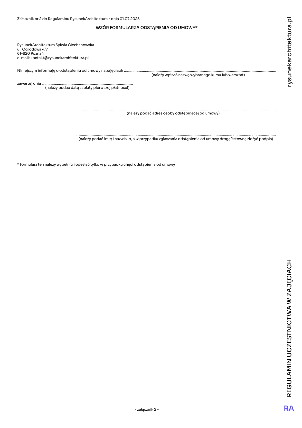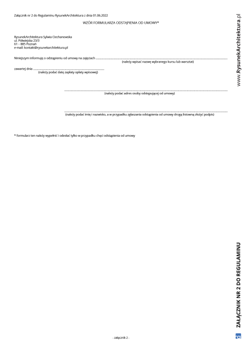 3. Wzór oświadczenia o odstąpieniu od umowy stanowi załącznik nr 2 do regulaminu, skorzystanie z wzoru odstąpienia od umowy nie jest obowiązkowe. Dla skutecznego odstąpienia od umowy wystarczające jest złożenie jednoznacznego oświadczenia na piśmie i przesłanie go pocztą lub za pośrednictwem poczty elektronicznej na adres e-mail kontakt@rysunekarchitektura.pl.