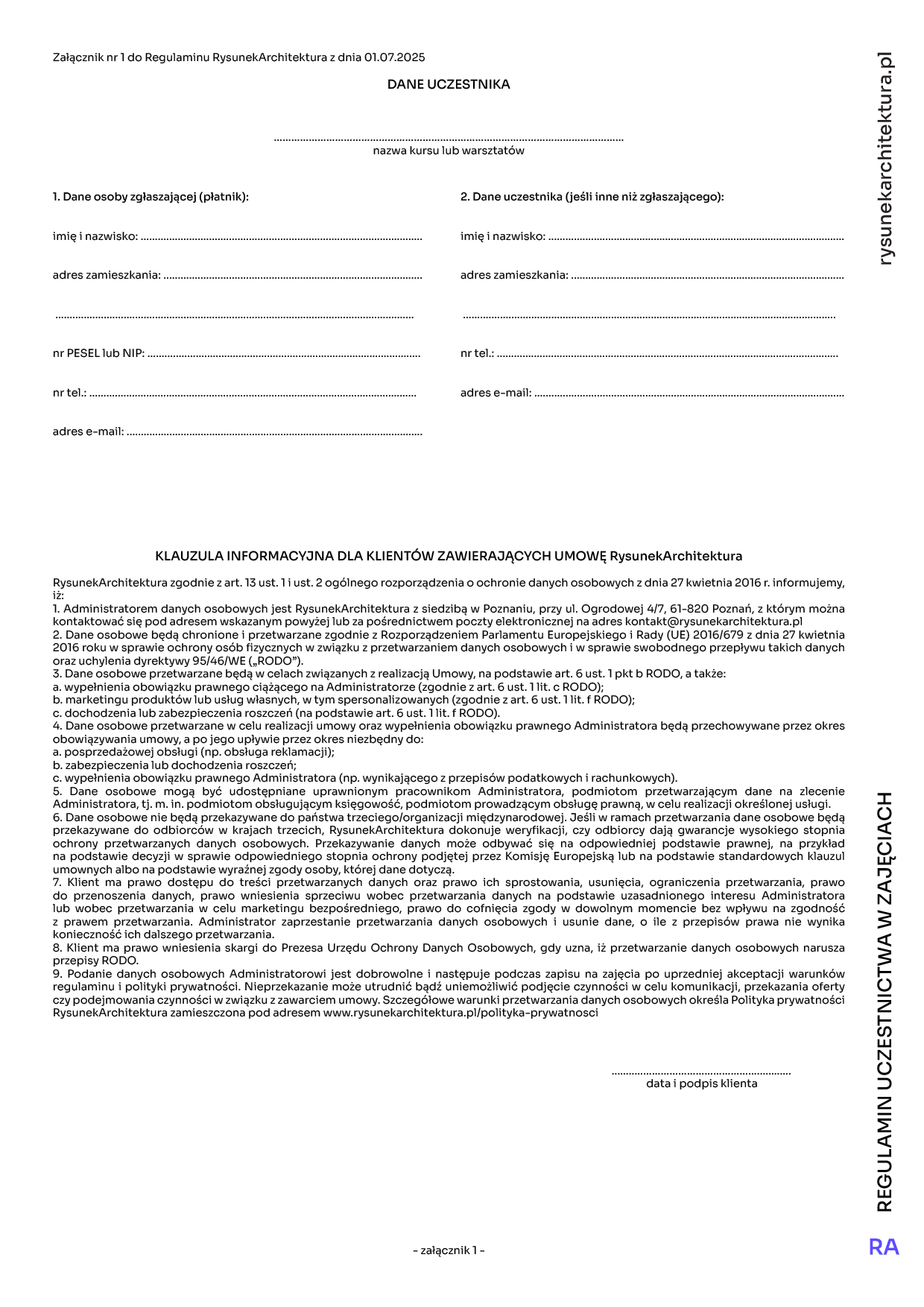 1. Organizatorem zajęć jest Sylwia Ciechanowska prowadząca działalność gospodarczą przy ul. Ogrodowej 4/7, 61-820 Poznań, pod firmą RysunekArchitektura Sylwia Ciechanowska, posiadająca NIP 774-296-81-95, posługująca się nr tel. 602 136 330 oraz adresem e-mail kontakt@rysunekarchitektura.pl zwana w dalszej części regulaminu „RA”.